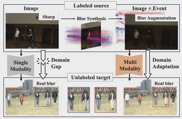 We propose an unsupervised domain adaptation approach for 2D human pose estimation under extreme motion blur by leveraging event cameras to generate motion-aware blurred images and adopting a student–teacher framework with uncertainty-aware pseudo-label refinement.